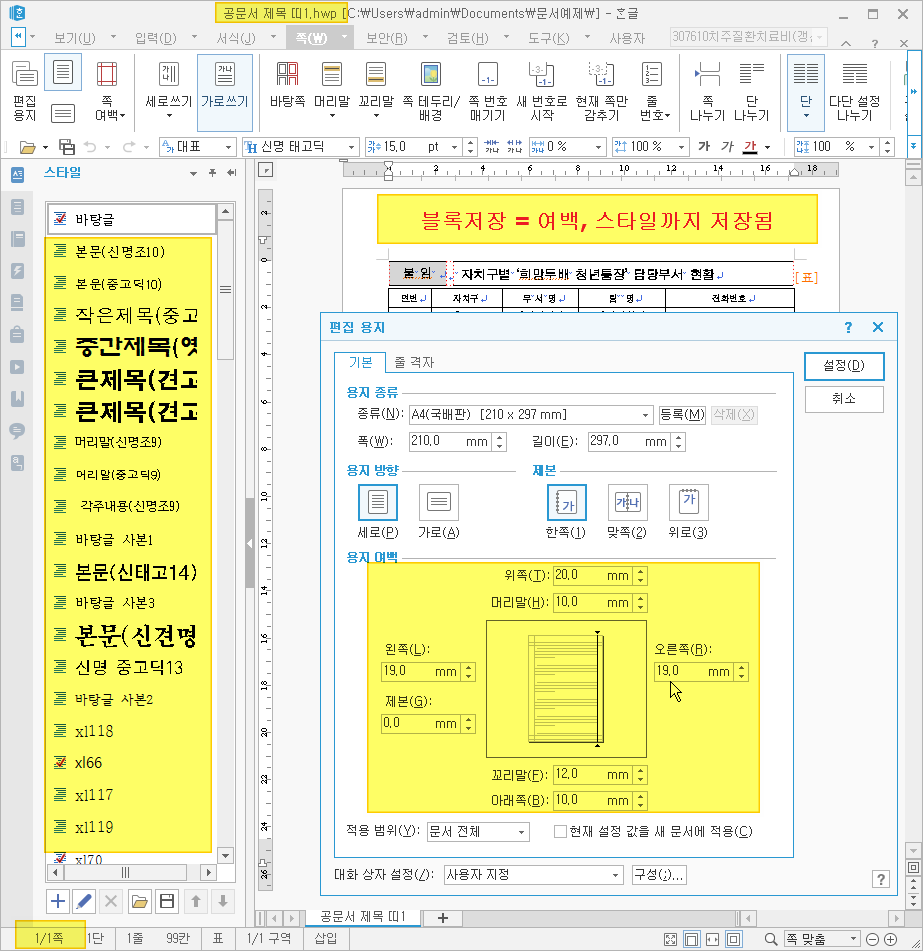 블록 저장은 일반적으로 여백이나 스타일, 또는 배경도 저장되기도 해요. 경우에 따라서는 단 등이 풀어지기도 하지만 일반적으로는 그 문서가 있던 그대로 저장이 됩니다. (확인 필요)